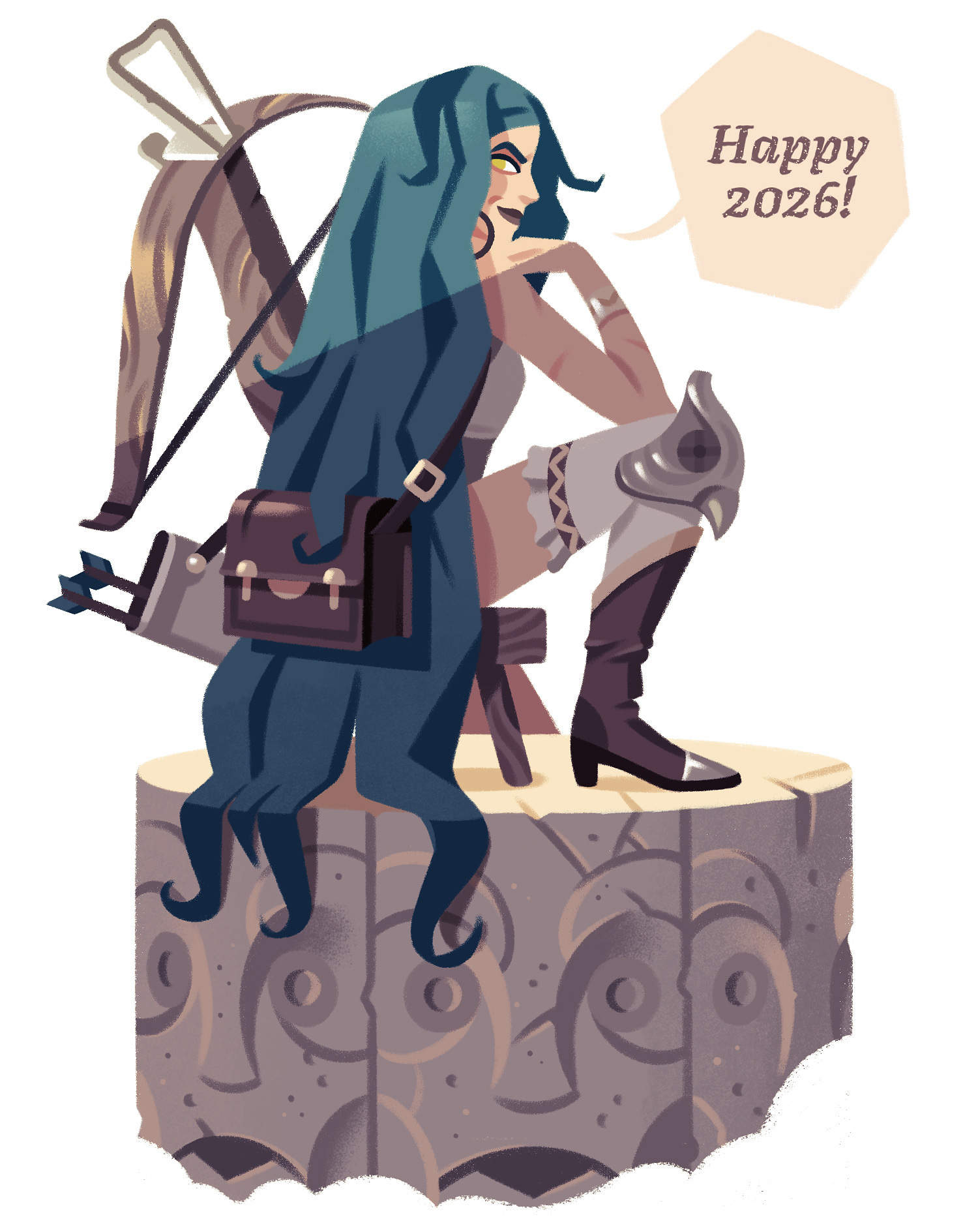 Nada puede ir mal en 2026 si la señorita de la ballesta nos desea felicidad. ¡Feliz año nuevo y por muchas incursiones más en la cueva, R! Tus ilustraciones, reflexiones y recomendaciones nos pueden salvar el día.