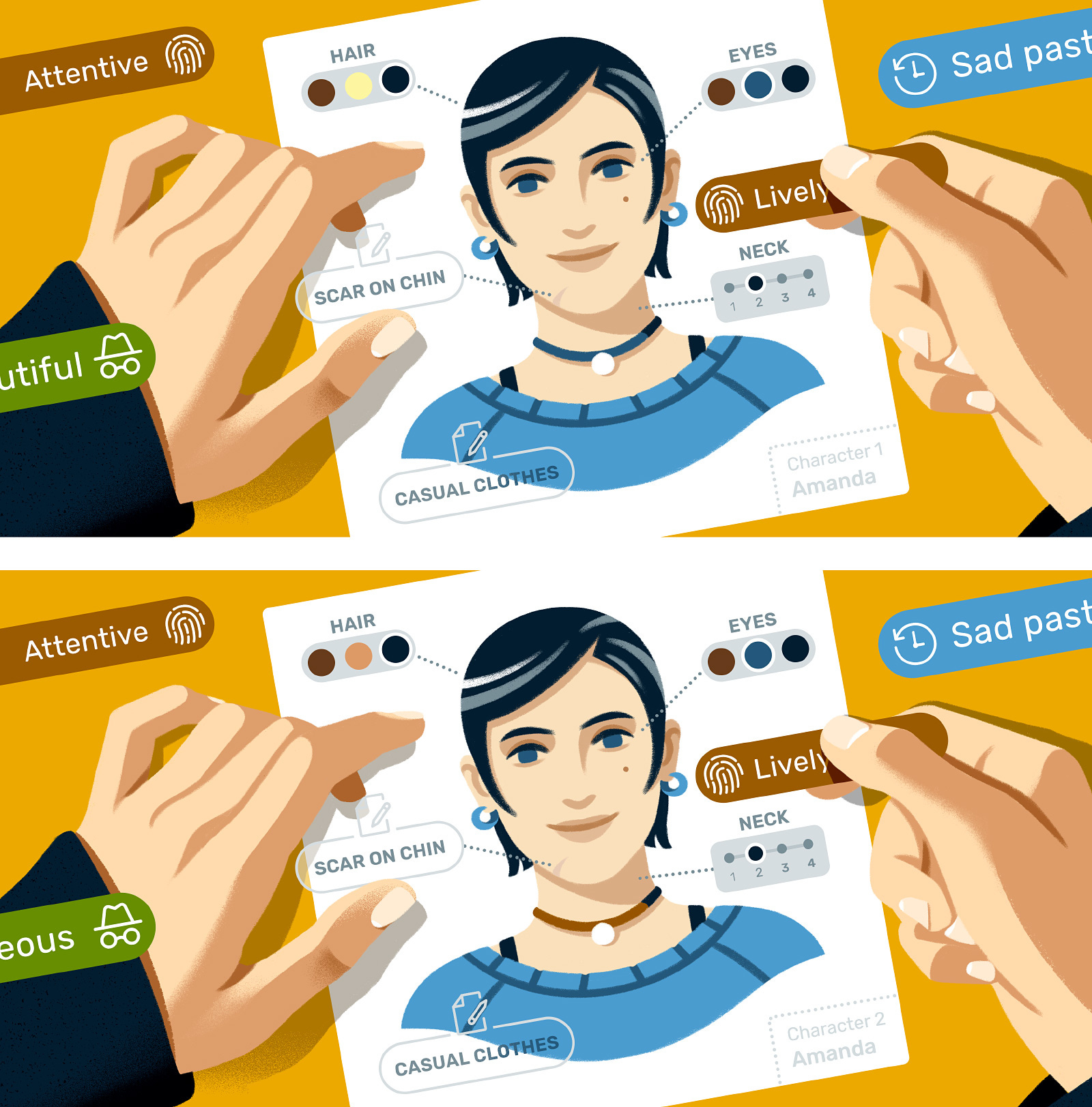 Try to find the 6 differences between these 2 images from a Reedsy article on Direct Characterisation. Extra hard on mobile. You’re warned!